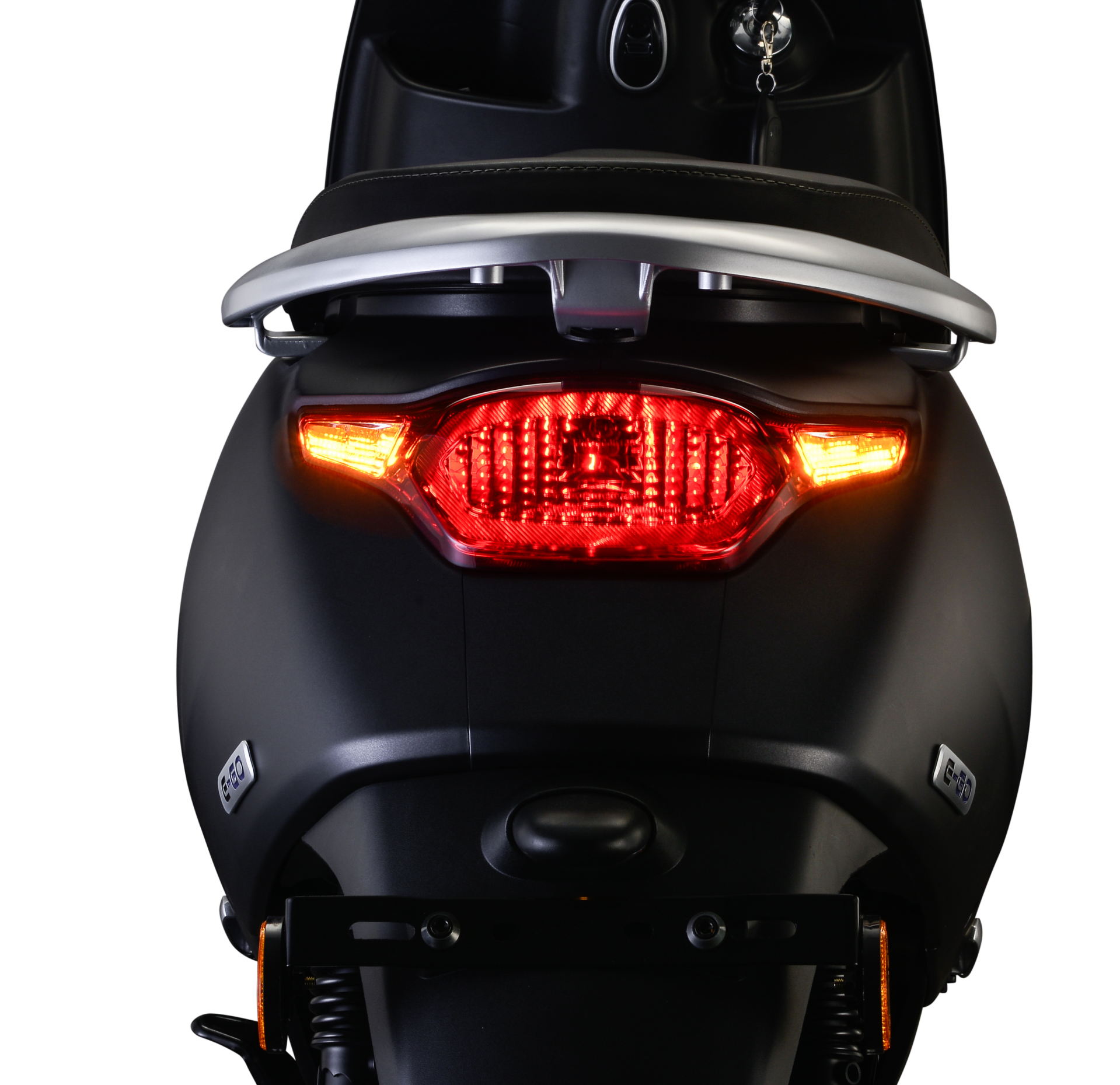 Als je een veilige e-scooter zoekt, is de IVA E-GO S3 een absolute aanrader. Om te beginnen voorkomt het EBS remsysteem (electronic brake system) slippen en blokkeren van de wielen. Je reactietijd en remweg zijn korter met EBS – een groot voordeel in lastige situaties! Met de heldere LED verlichting ben je bovendien altijd goed zichtbaar. Je snelheid, benzinepeil en alles wat je verder nodig hebt lees je af van het duidelijke LCD scherm. Bijzonder aan de IVA E-GO S3 is ook de oersterke titanium achterbrug: deze biedt extra stevigheid op het wegdek. Passagier mee? Dan klap je gewoon de voetensteuntjes uit. Tot slot kun je de IVA E-GO S3 met een gerust hart parkeren: hij is standaard voorzien van een alarmsysteem!