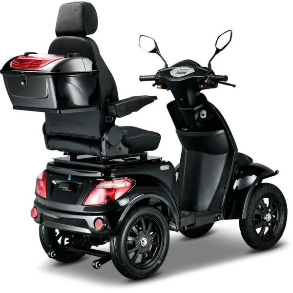 De moderne en stijlvolle scootmobiel heeft een leeggewicht van 74 kg, wat ervoor zorgt dat je in combinatie met de vier grote wielen te allen tijde stabiliteit ervaart. De krachtige motor brengt je in een razend tempo op plek van bestemming. De comfortabele captain seat zorgt ervoor dat je prettig kunt zitten tijdens jouw rit. Voor optimaal comfort kun je de armleuningen verstellen, zodat de stoel geheel aangepast kan worden naar jouw houding en wensen. Onder de stoel is opbergruimte beschikbaar om eenvoudig kleine spullen op te bergen. Daarnaast is het mogelijk om een koffer bij te bestellen, zodat je nog meer opbergruimte tot je beschikking hebt.